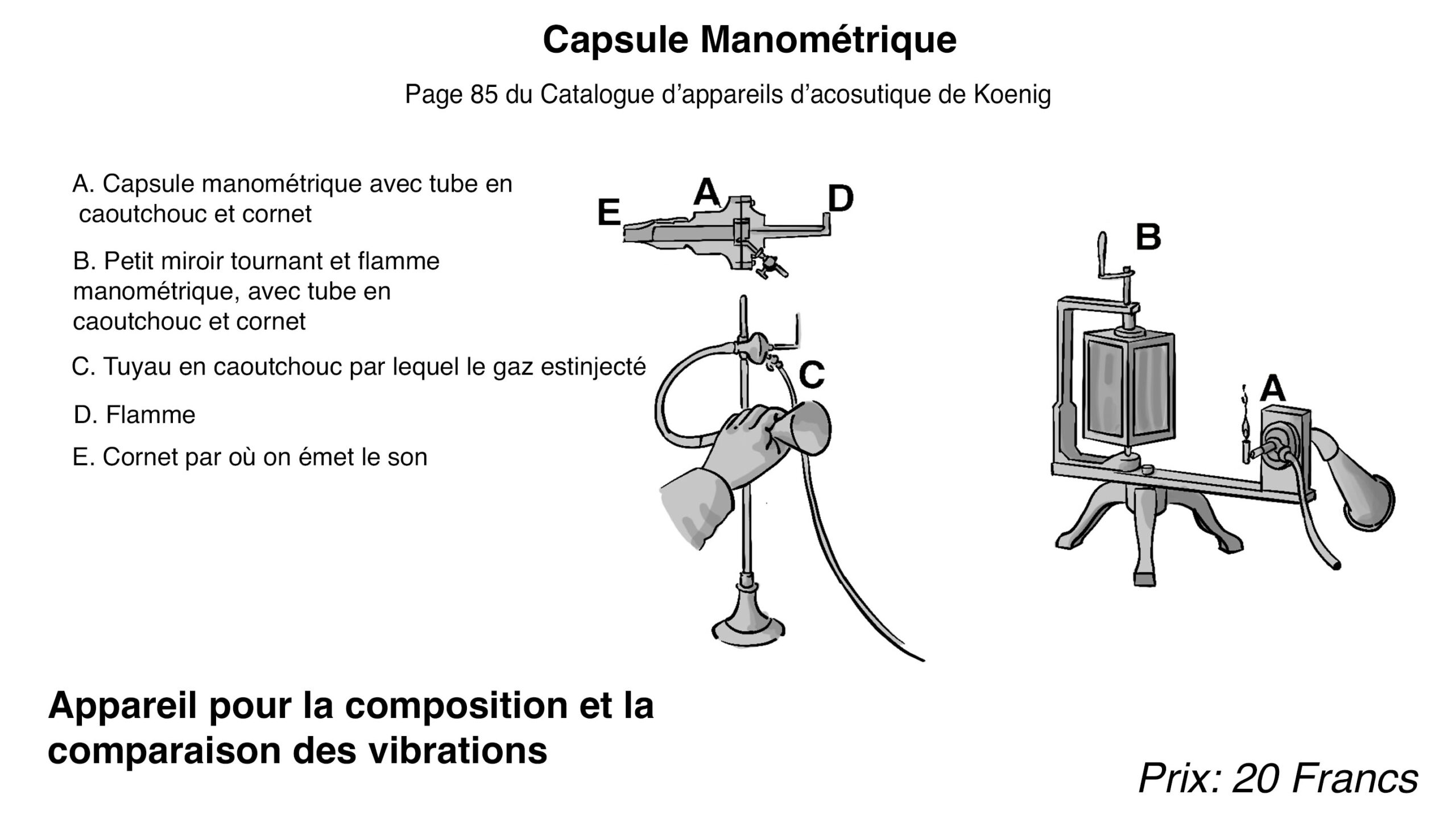 Un tube à gaz est relié à la capsule, le gaz la traverse et s’échappe par un bec que l’on allume. Le gaz pénètre dans la moitié droite de la capsule et s’échappe par le bec dirigé verticalement. Avec une embouchure en forme de cornet acoustique, on fait arriver un son dans la moitié gauche de la capsule dont la cloison se met à vibrer, comprime et raréfie tour à tour le gaz qui la traverse faisant changer la flamme d’aspect. Pour dissocier ces flammes de diverses hauteurs, Koenig utilisait un miroir tournant.