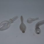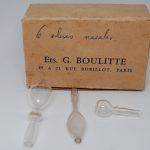- Inventeur : Ce n’est pas facile de déterminé qui est l ‘inventeur. On retrouve avant les olives dans le catalogue de Verdun des canules en verre de différentes tailles utilisés pour les artères et qu’il attribut à Fr. Franck mais elles n’ont pas la forme caractéristiques des olives nasales (Verdun, 1880 : 14). Rosapelly dit dès 1876 dit mesurer la pression nasale au moyen d’un tuyau inséré dans une narine mais ne parle pas d’olive et le schéma qui sera fournit par Marey 1898 : 446, ne semble pas montré d’olive mais seulement un tube.